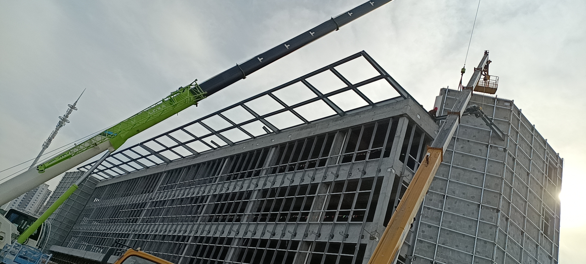 ,最大单体面积14200平方米,最大跨度18米,最大檐高15.5米,钢结构总重量约1000T。