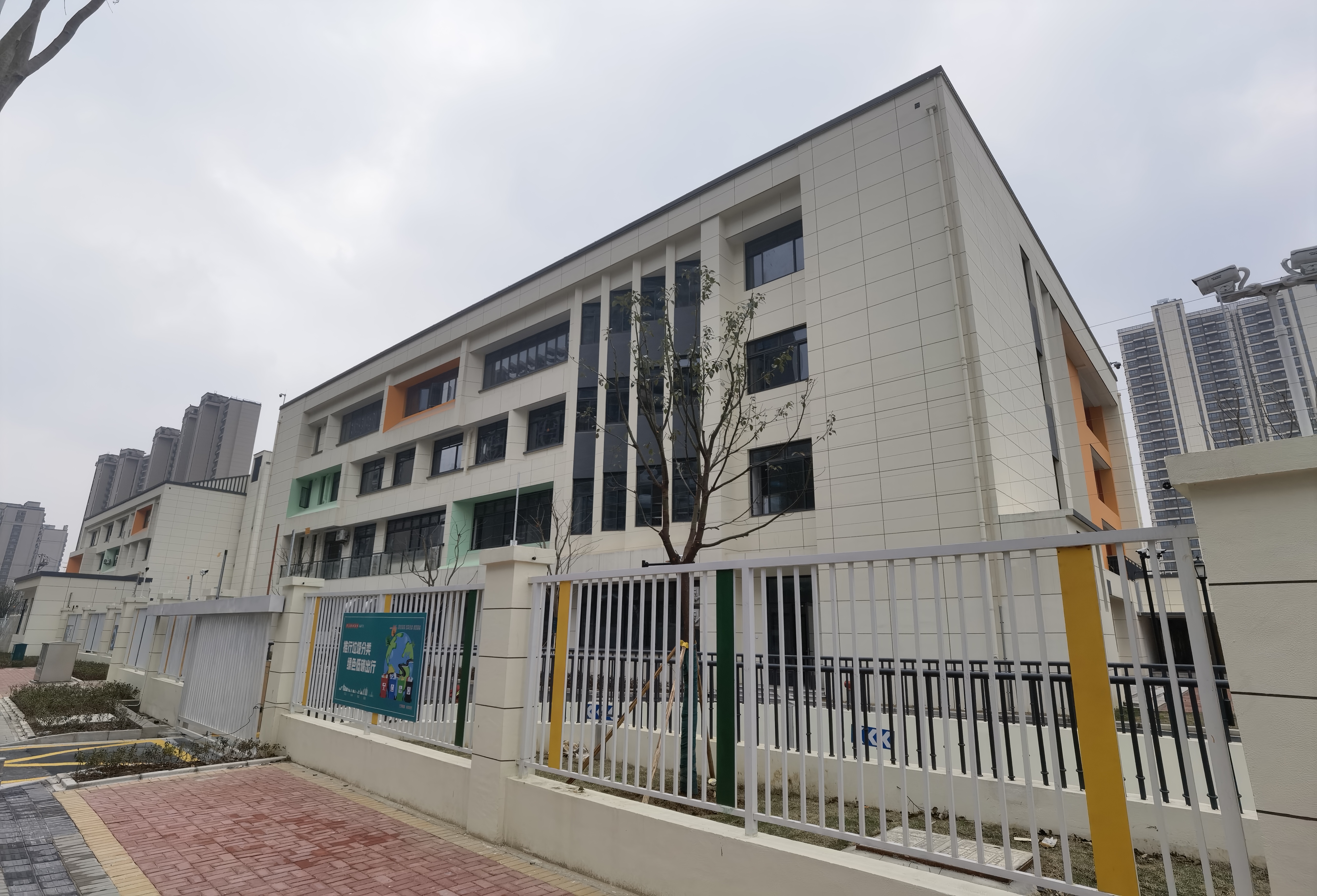建设规模:包括:普教楼、专教楼、行政图书楼、报告厅、食堂、风雨操场、看台、门卫一、门卫二、地下车库及人防,总建筑面积34307.63平方米(含地下车库及人防建筑面积8100平方米),其中最大单体建筑面积34217平方米(含地下车库及人防建筑面积8100平方米),框架结构,地上4层,地下1层,最高檐高19.55米,最大单跨27.64米。