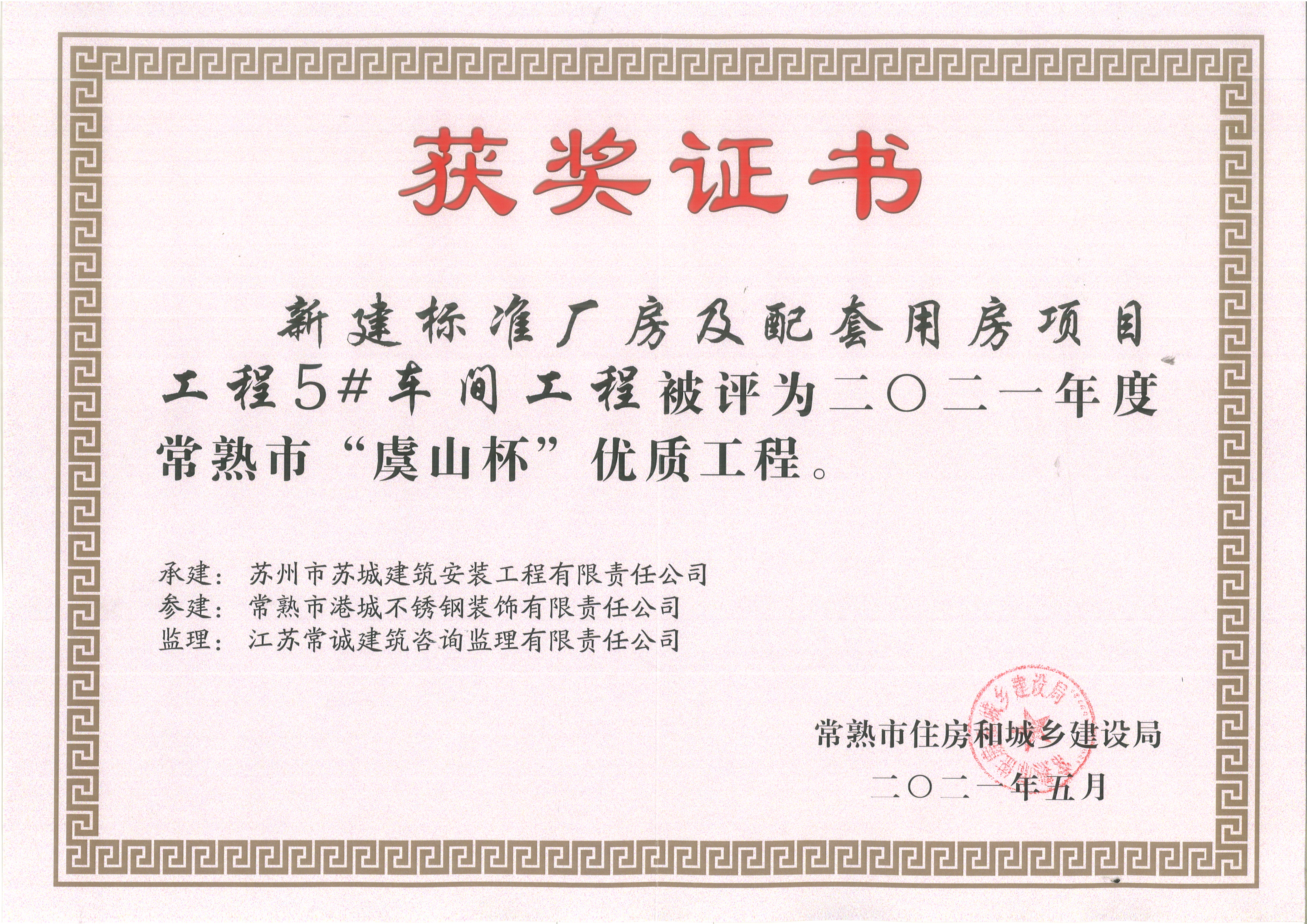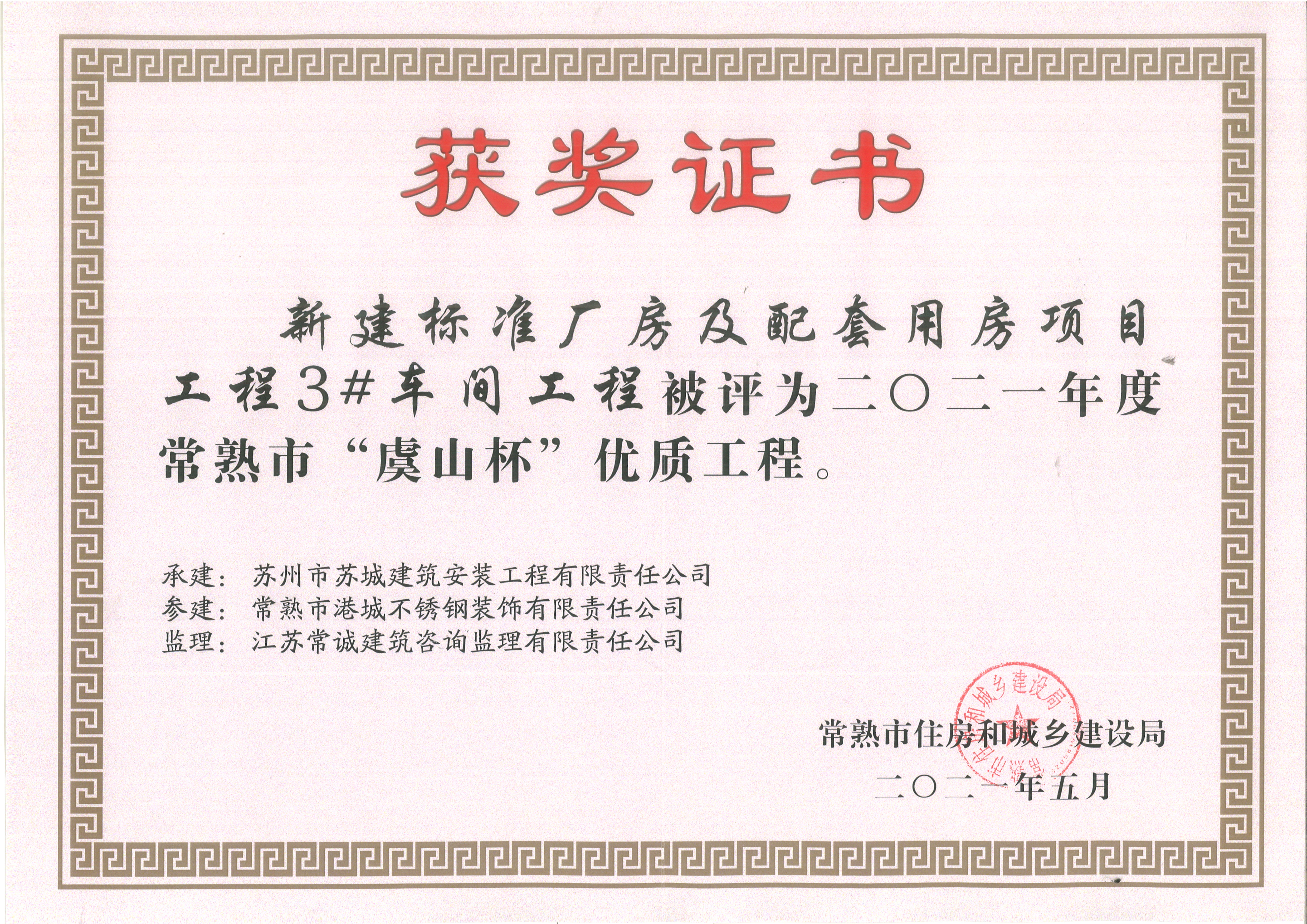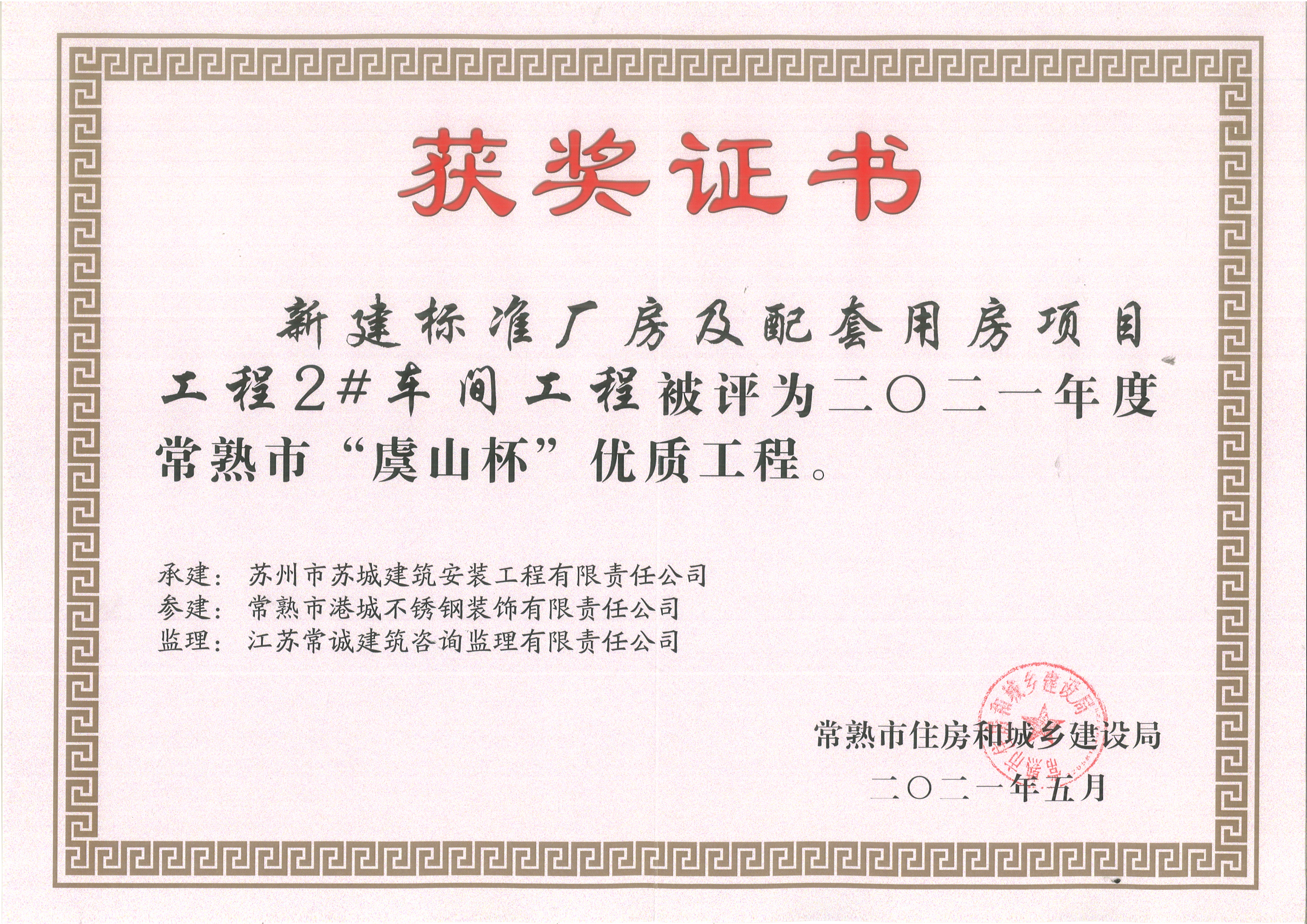 常熟市港城不锈钢装饰有限责任公司再获三个“虞山杯”优质工程奖项!本公司在2019年位于常熟市经济技术开发区的新建标准厂房1#-5#车间钢结构工程的三个单体工程,即2号车间、3号车间和5号车间,再次被评为“虞山杯”优质工程。一直以来,公司秉承“安全保障,质量第一,客户满意”的核心要求,将安全贯穿于工程建设全过程,强化质量第一的责任意识,严格规范施工、把好质量关,努力打造精品工程、标杆工程,赢得社会各界高度赞誉和好评。