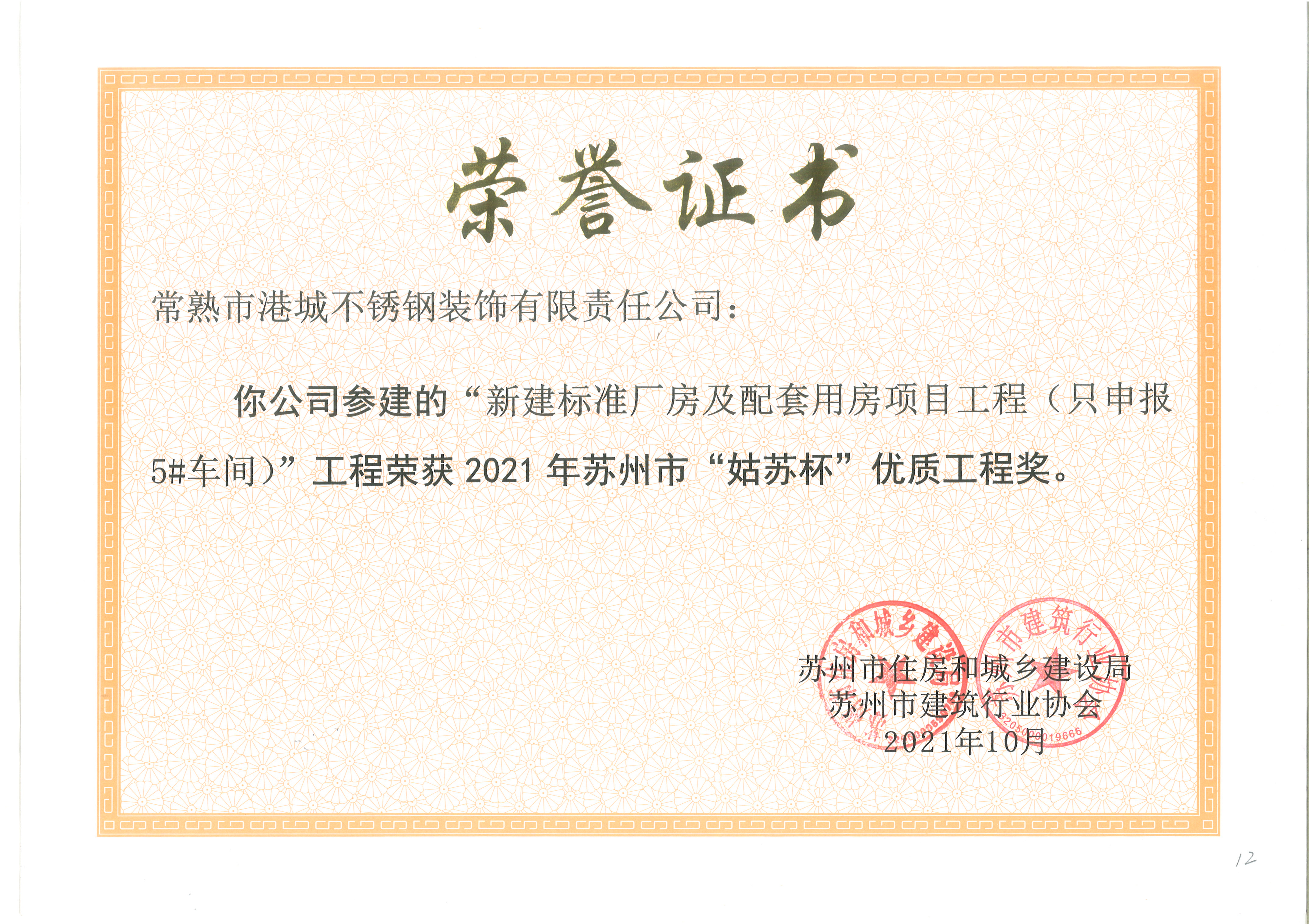 捷报频传!常熟市港城不锈钢装饰有限责任公司参建的两个项目获得2021年苏州市“姑苏杯”优质工程奖!这两个工程分别是: